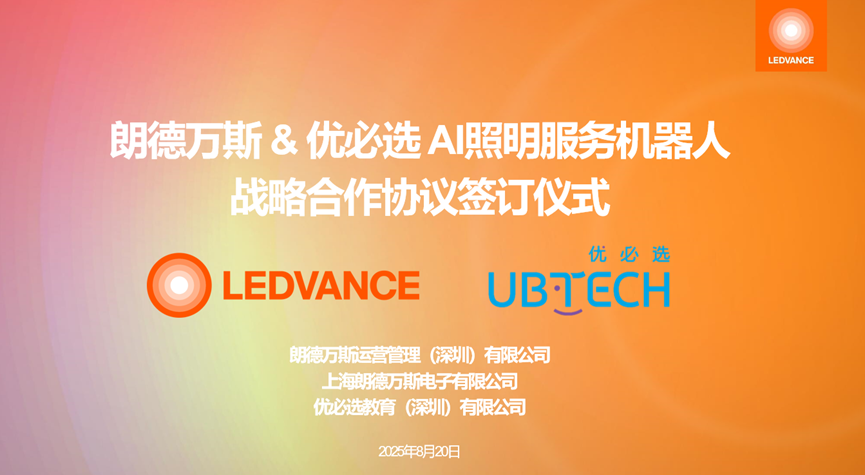 2025年8月20日,木林森股份旗下朗德萬(wàn)斯照明與優(yōu)必選教育(深圳)有限公司正式簽署戰略合作協(xié)議,朗德萬(wàn)斯全球研發(fā)總監陳華明、朗德萬(wàn)斯中國區CEO張鵬與優(yōu)必選教育研發(fā)負責人楊壯共同出席簽約儀式。此次雙方宣布將在A(yíng)I照明機器人領(lǐng)域展開(kāi)深度合作,旨在整合優(yōu)勢資源,共同推動(dòng)AI照明機器人技術(shù)的創(chuàng )新與應用,為全球用戶(hù)帶來(lái)更加智能、便捷的照明解決方案。